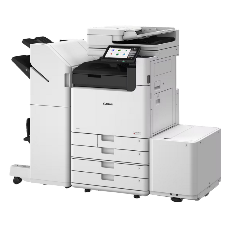 Digital Colour MFP A3 These models require licenses: IMAGEFORCE C5150 LICENSE@E IMAGEFORCE C5160 LICENSE@E IMAGEFORCE C5170 LICENSE@E Main Unit Machine Type: A3 Colour Multifunctional Core Functions: Print, Copy, Scan, Send, Store and Optional Fax Processor Speed: 1.8GHz Dual Core Processor Control Panel: 10.1" TFT LCD WSVGA Colour Touch panel Memory: RAM: 6GB Storage: Standard: (SSD) 256GB, Optional: (SSD) 1TB Interface Connection: NETWORK Standard: 1000Base-T/100Base-TX/10Base-T Optional: Wireless LAN (IEEE 802.11a/b/g/n/ac/ax) OTHERS Standard: USB 2.0 (Host) x1, USB 3.0 (Host) x1, USB 2.0 (Device) x1 Optional: Serial Interface, Copy Control Interface Network Protocols: File: FTP(TCP/IP), SMB3.0 (TCP/IP), WebDAV, E-mail/I-Fax: SMTP, POP3 Paper Supply Capacity (A4, 80 gsm): Standard: 1.200 sheets: 100-sheet Multi-purpose tray x 1, 550-sheet Paper cassette x 2 Maximum: 6,350 sheets (with High Capacity Cassette Feeding Unit-F1 + Paper Deck Unit-F2) Paper Output Capacity (A4, 80 gsm): Maximum: 3,450 Sheets (with Staple Finisher-AB3 or Paper Folding/Booklet Finisher-A2 and 3rd Copy Tray Kit-A1) Supported Media Weights: Multi-purpose tray: 52 to 300 gsm Paper Cassette (Upper): 52 to 256 gsm Paper Cassette (Lower): 52 to 300 gsm Duplex: 52 to 256 gsm Warm-up Time: Quick Startup Mode: 4 Seconds or less From Sleep Mode: 6 Seconds or less From Power On: 6 Seconds or less Print Specifications Print Speed: up to __ ppm (A4, A5*, A5R, A6R*), up to __ ppm (A3), up to __ ppm (A4R) Print Resolution (dpi): 4,800 x 2,400 Page Description Languages: Standard: UFR II, PCL6, Adobe® PostScript®3TM Double-Sided Printing: Yes Direct Print: Supported file types: PDF, EPS, TIFF/JPEG, and XPS Copy Specifications Copy Speed: up to __ ppm (A4, A5*, A5R, A6R), up to __ ppm (A3), up to __ ppm (A4R) First-Copy-Out Time: Approx. __ / __ seconds or less Copy Resolution (dpi): 600 x 600 Multiple Copies: Up to 999 copies Magnification: Variable zoom: 25% to 400% (1% Increments) Scan Specifications Type: Single-pass Duplexing Automatic Document Feeder, 2-sided to 2-sided (Automatic) Pull Scan Specifications Colour Network ScanGear2. For both TWAIN and WIA Scan Resolution (dpi): 600 x 600 Acceptable Originals/Weights: Document Feeder media weight: 1-sided scanning: 38 to 220 gsm (BW, CL) 2-sided scanning: 38 to 220 gsm (BW, CL) Scan Speed: 1-sided Scanning: 135/135 ipm (300 x 300 dpi, send), 80/80 ipm (600 x 600 dpi, copy) 2-sided Scanning: 270/270 ipm (300 x 300 dpi, send), 160/90 ipm (600 x 600 dpi, copy) Double-Sided Scanning: Yes Send Specifications Standard Destination: Standard: E-mail/Internet FAX (SMTP*), SMB3.0, FTP, WebDAV, Mail Box Optional: Super G3 FAX, IP Fax Address Book / Speed Dials: LDAP (2,000)/Local (1,600)/Speed dial (200) Send Resolution (dpi): Push: up to 600 x 600, Pull: up to 600 x 600 Consumables: Not included in the box Toner Estimated Yield, @ 5% Coverage) Toner 1001 BK: 63,000 pages Toner 1001 C/M/Y: 54,500 pages Toner 1001L C/M/Y: 24,000 pages