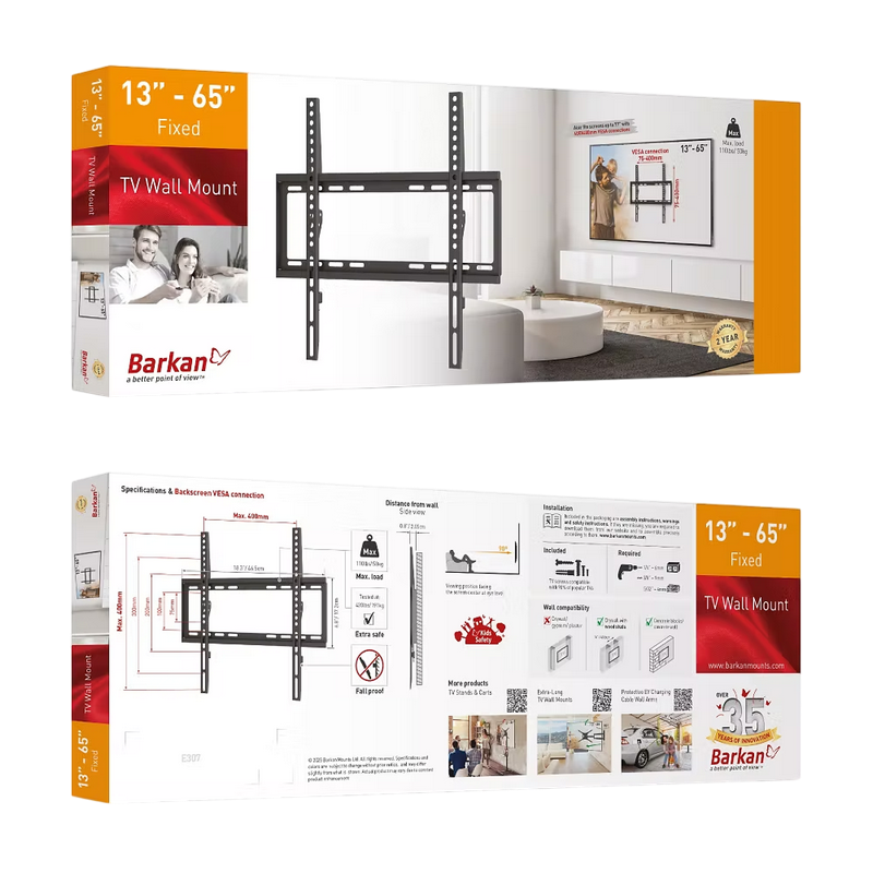Wall Mount Barkan ''E307'' Black 13" - 65" Fixed, max.50kg, VESA mm: up to 400x400mm